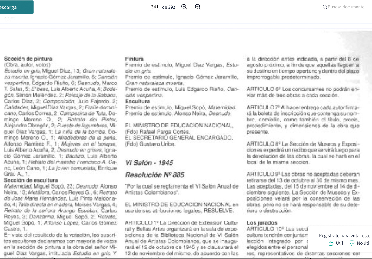1944 V Salón Anual de Artistas Colombianos - Créditos: https://es.scribd.com/doc/66073524/50anos-SNA#scribd [/.../La crisis institucional planteada con el fracaso del salón anterior /.../ En la introducción al catálogo, esta voluntad de conciliación quedó claramente expresada: "Todo cuanto ha sido objeto de discusión, cuanto ha merecido observaciones juiciosas de parte de los expositores o del publico, fue considerado serenamente por el Ministerio para corregir los errores para modificar las normas de organización, con el criterio amplio de complacerlas más diversas exigencias. En esta última ocasión se dejó en las propias manos de ellos [pintores y escultores} la decisión de admitir las obras y la facultad de calificarlas en votación democrática, con el mínimo de intervención oficial. Nadie podrá sostener, con verdad, que el Minis-terio, por conducto de ninguno de sus organismos, ha influido directa ni indirectamente en los resultados finales."Así, un jurado de admisión integrado por cinco Maestros efectuó la selección /.../]. [Se discutió en segundo lugar el tema de los premios. Se otorgaron cuatro, de setecientos cincuenta pesos cada uno, en lugar de los dos primeros de mil pesos y los segundos de quinientos que se habían acordado en los cuatro salones anteriores. Estos premios, llamados de estímulo, dos para pintura y dos para escultura, no llevaron orden numérico, es decir, no hay primero ni segundo].